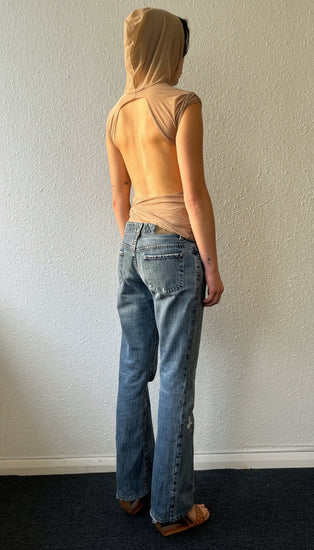 CHARLIE open-back dress with drapes and hood, in NUDE mesh.