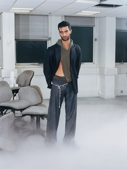 NOLAN tailored jacket in two-tone charcoal with piping details.