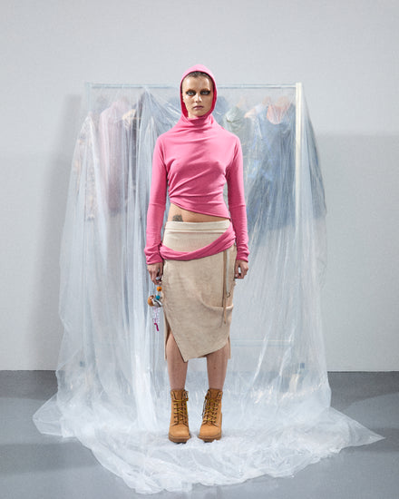 UMI hand-painted rib skirt with side openings and drape detail in beige/copper.